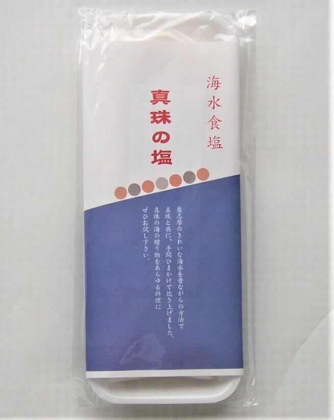この『真珠の塩』は、太平洋に面した奥志摩のきれいな海水を昔ながらの製法による平釜にて、じっくりと炊き上げた食塩です。真珠と真珠貝を一緒に入れて炊き上げますと、風味豊かな塩が出来上がります。